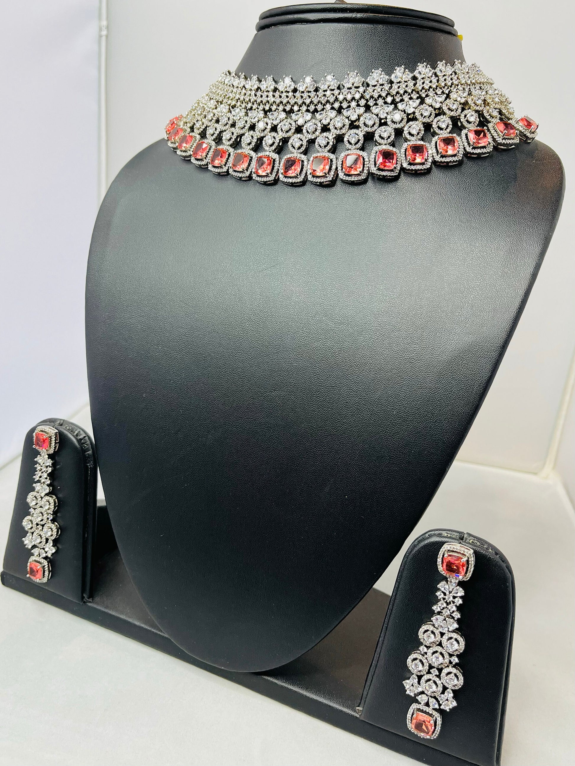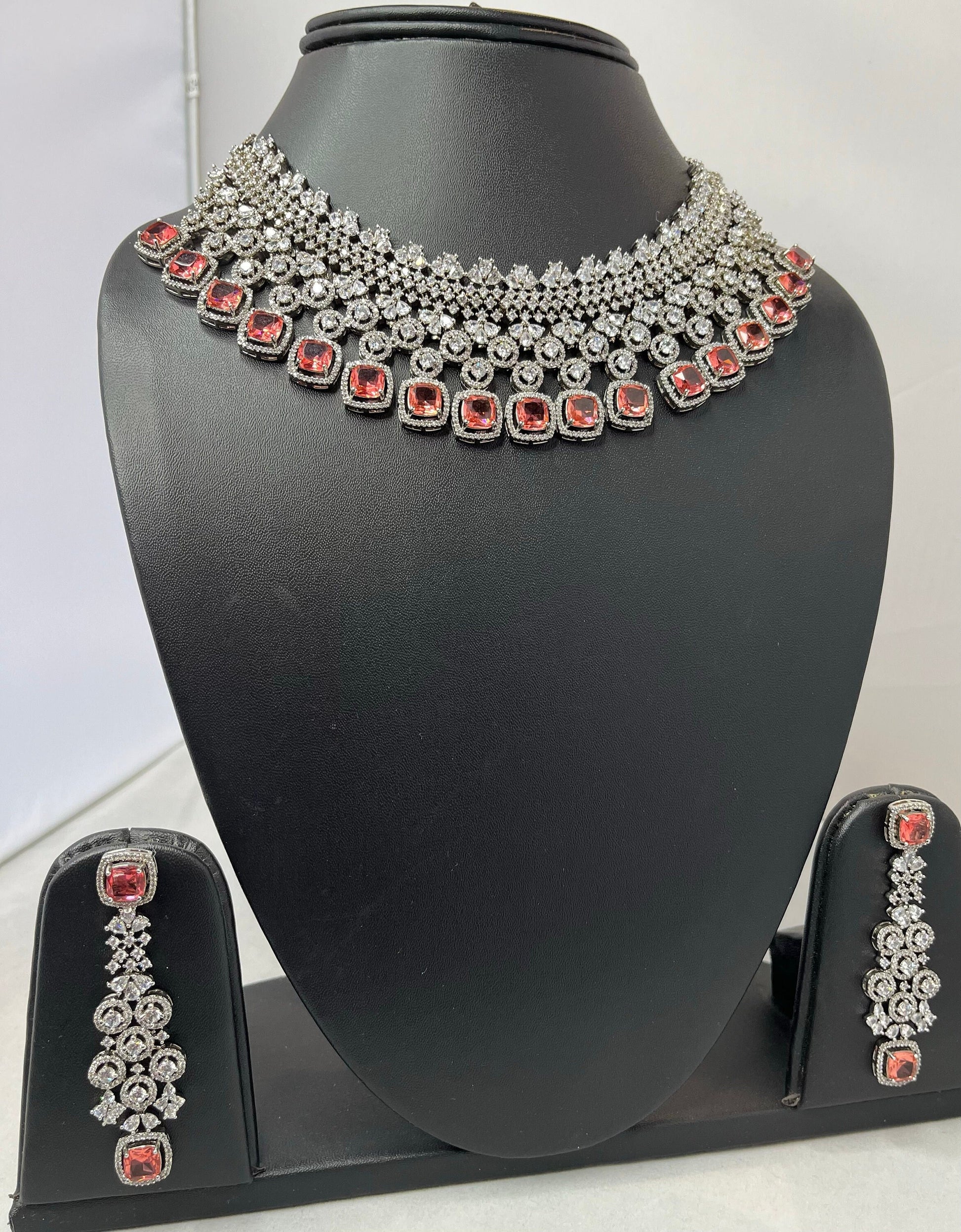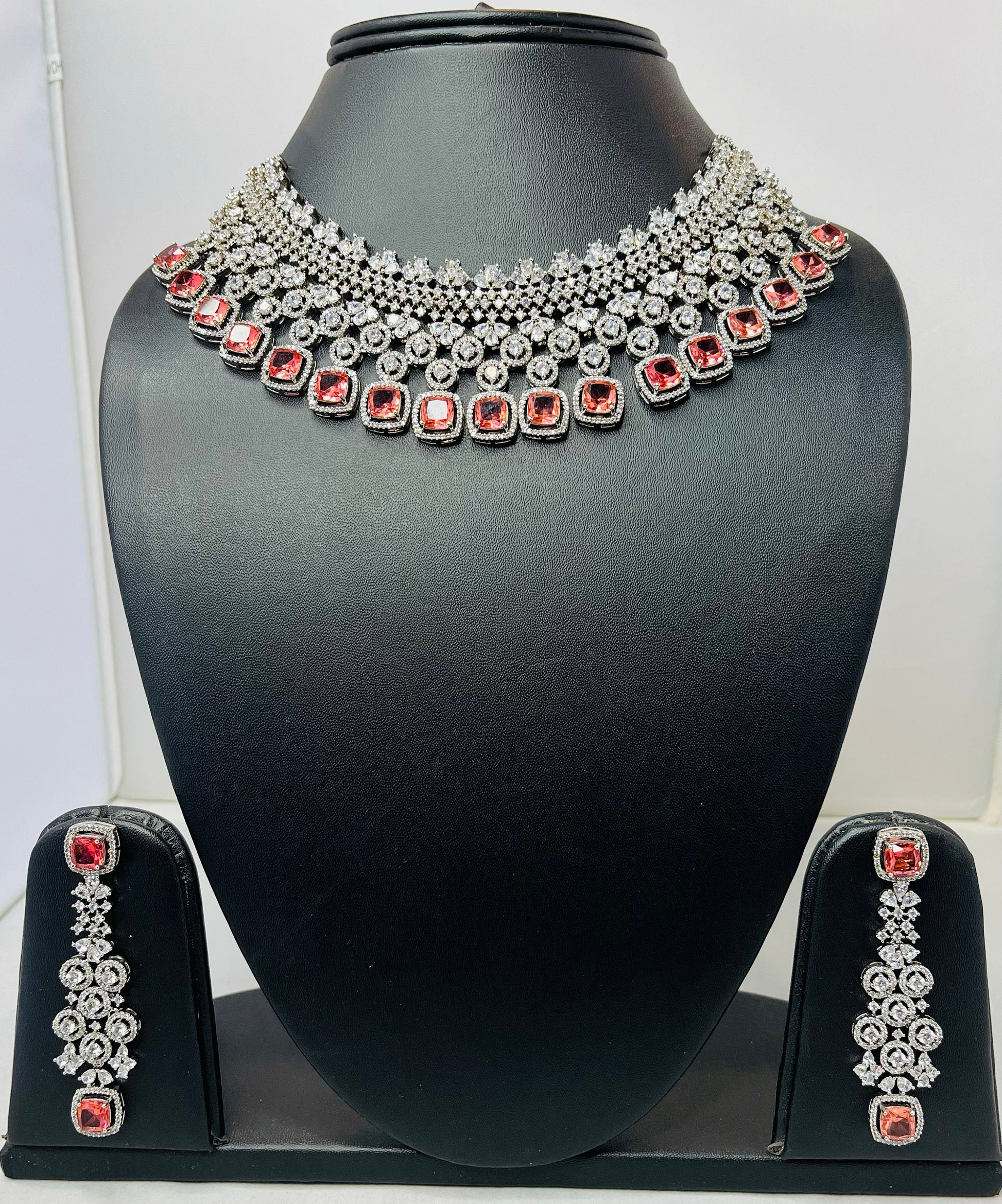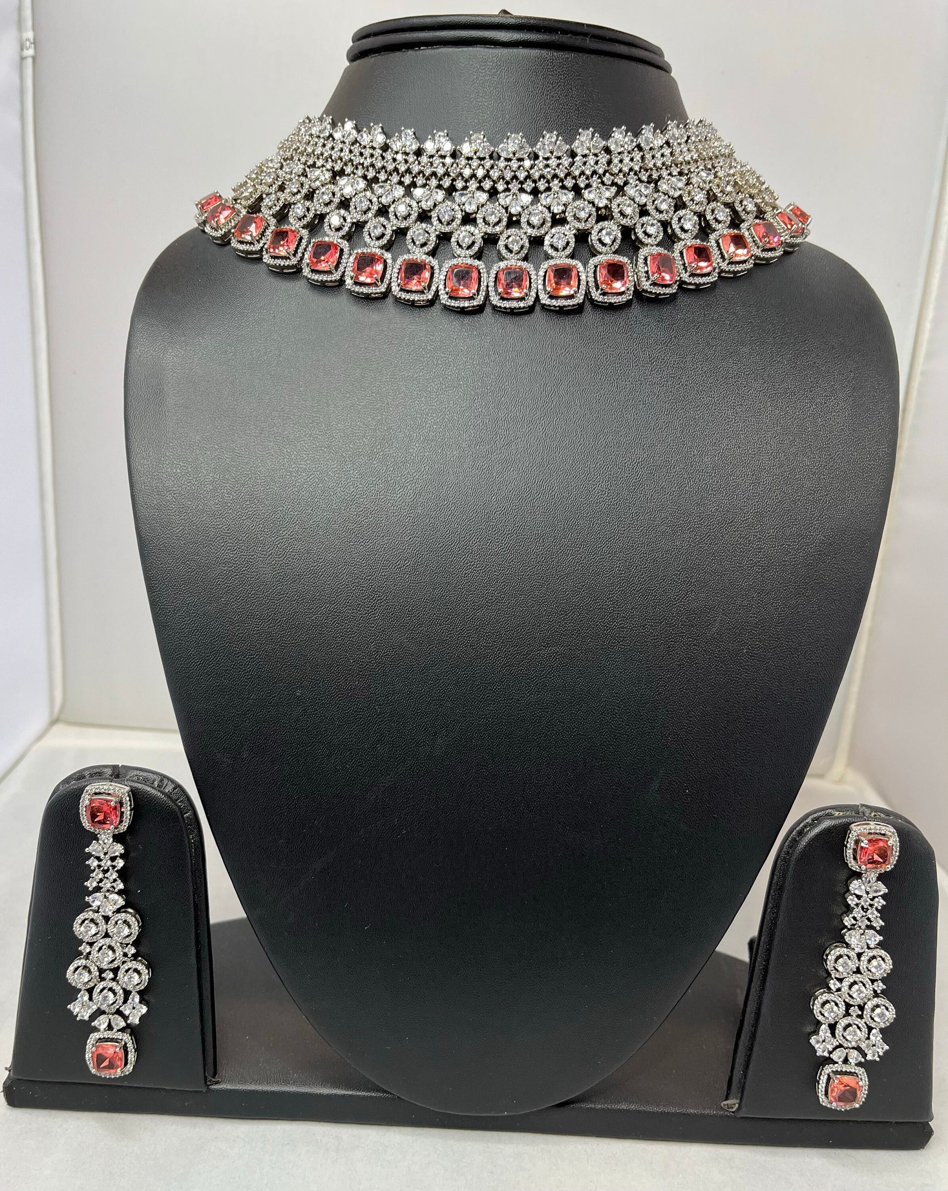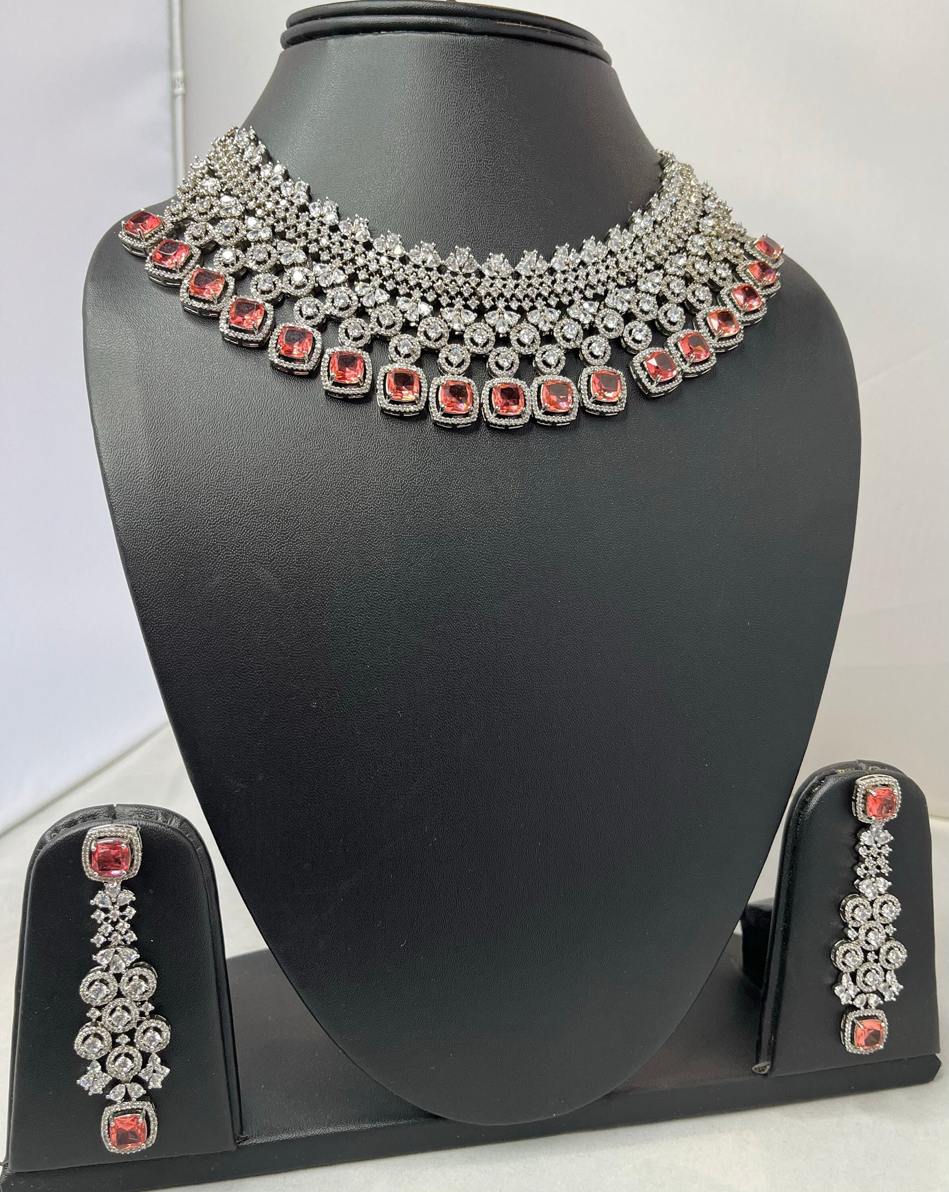 Silver Plated American Diamond Studded Necklace & Drop Earings set with Peach Color Stones. It gives a simple, yet classy look, highlighting the brilliance of the stone