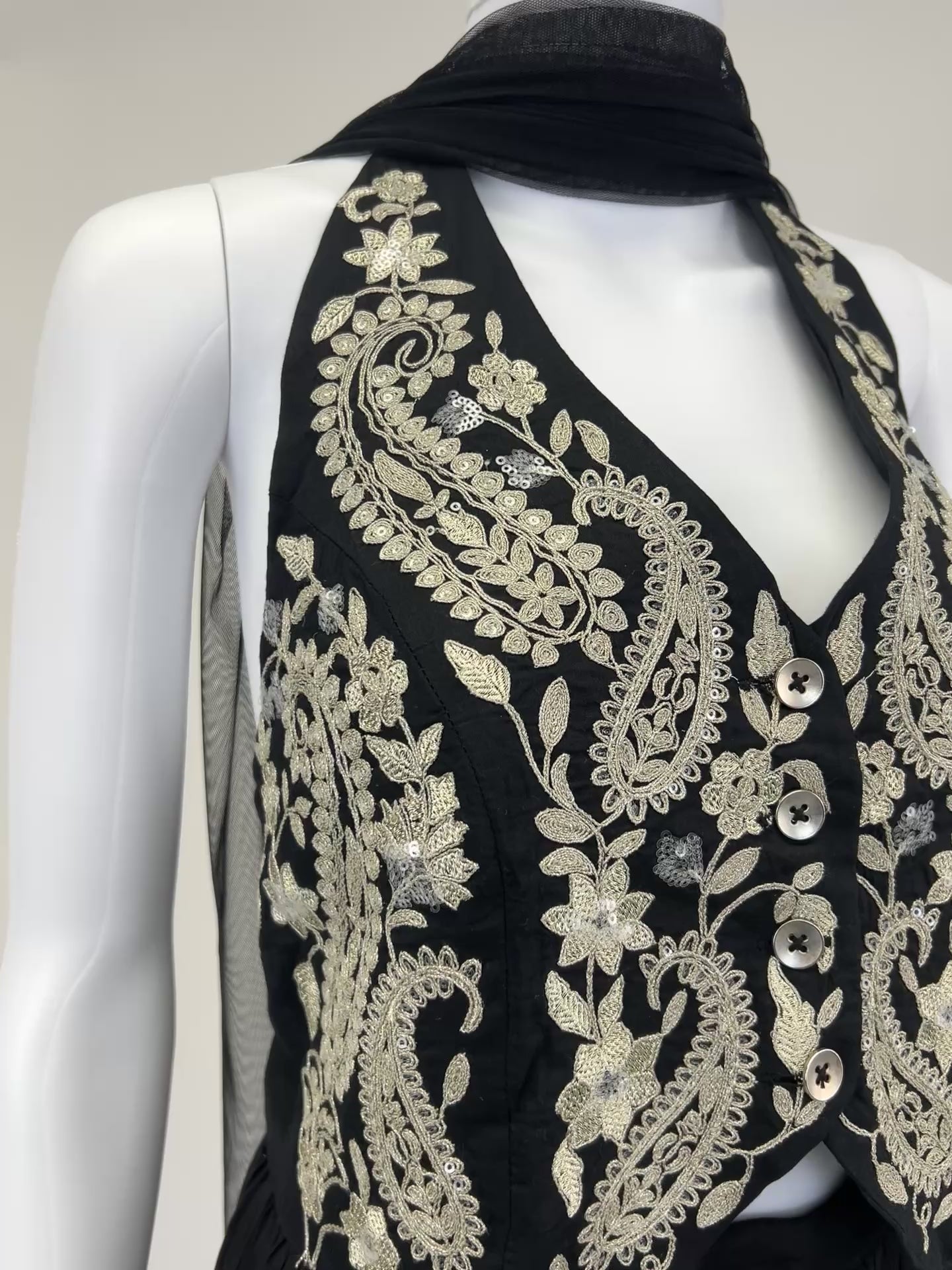 This black ethnic 3-piece lehnga set beautifully blends traditional elegance with a modern, statement-making design. The blouse is richly embellished with intricate gold-accented hand embroidery, adding a luxurious and eye-catching appeal.