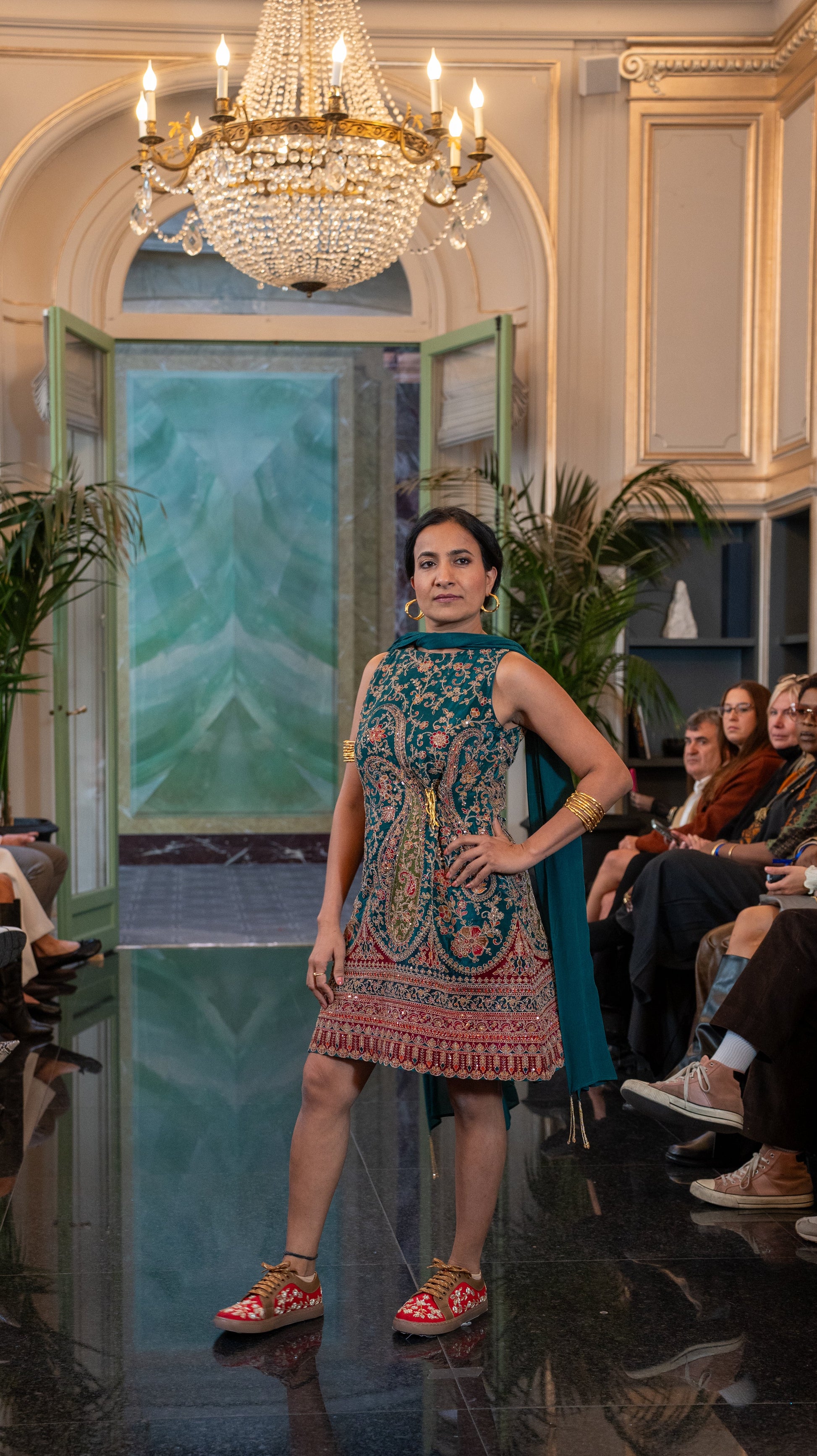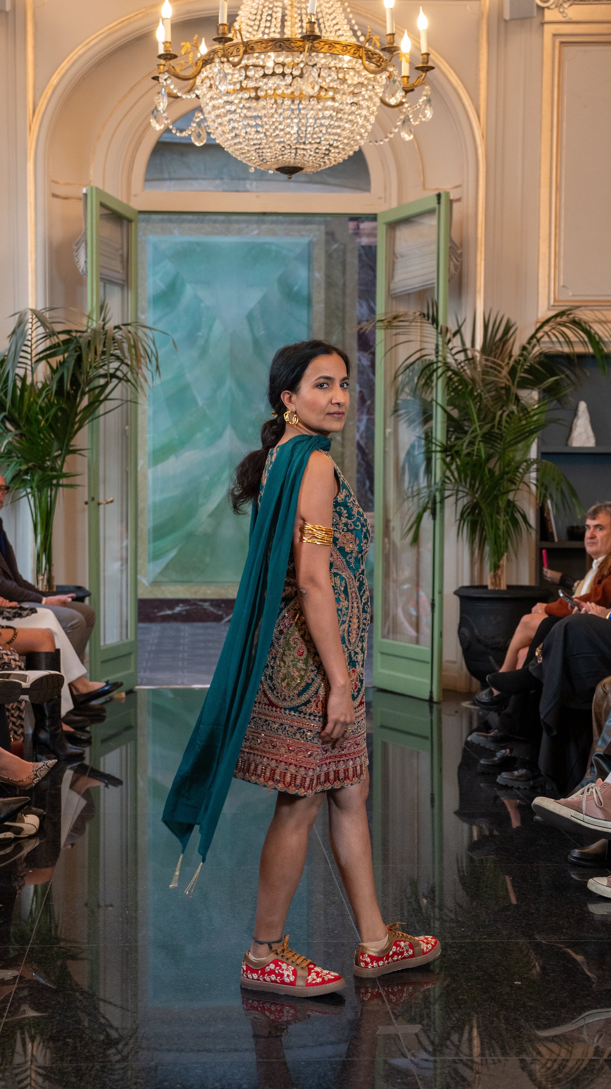 The jewel tone peacock color knee length dress is perfect for any festivities or cocktail party.
