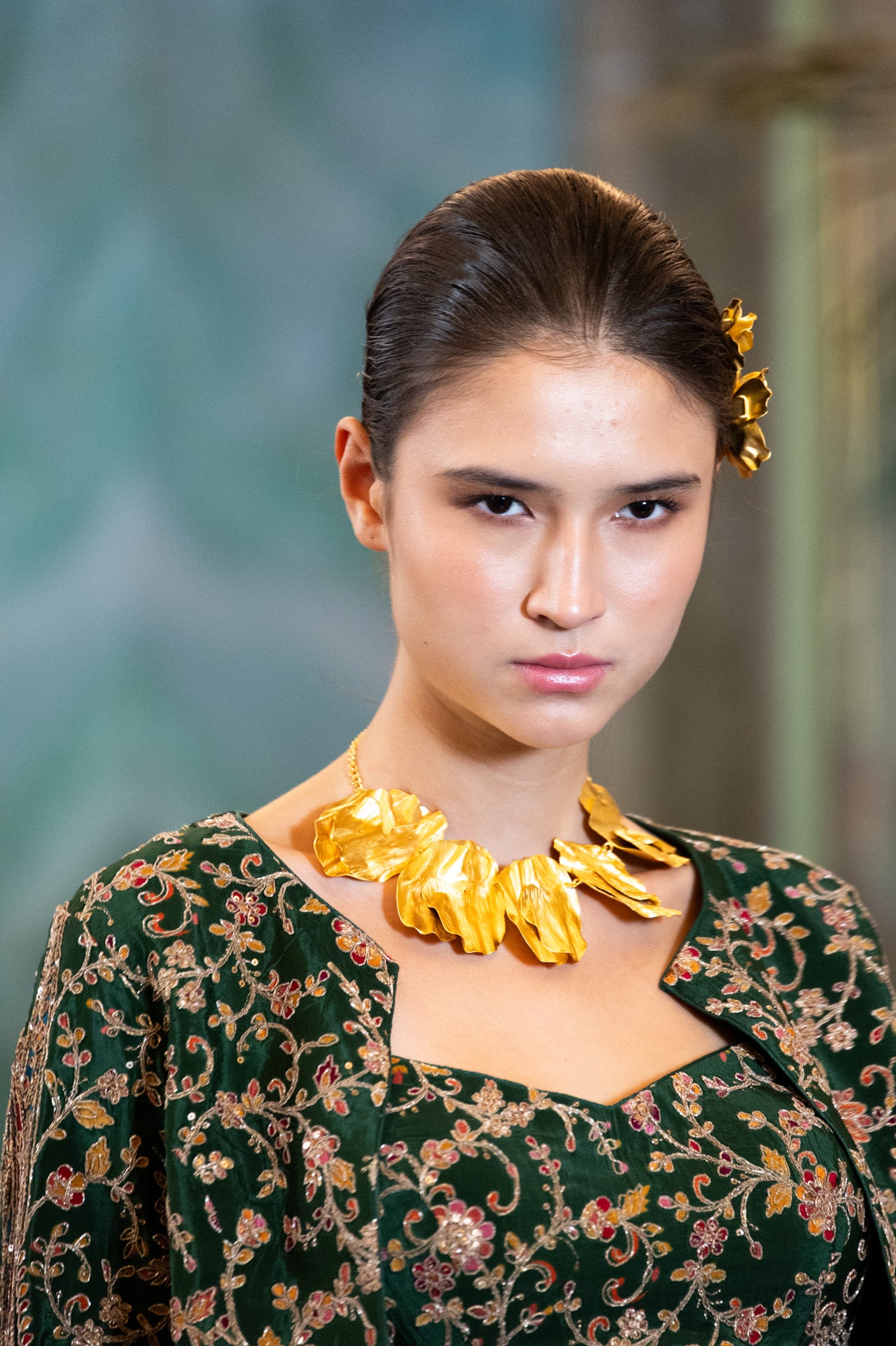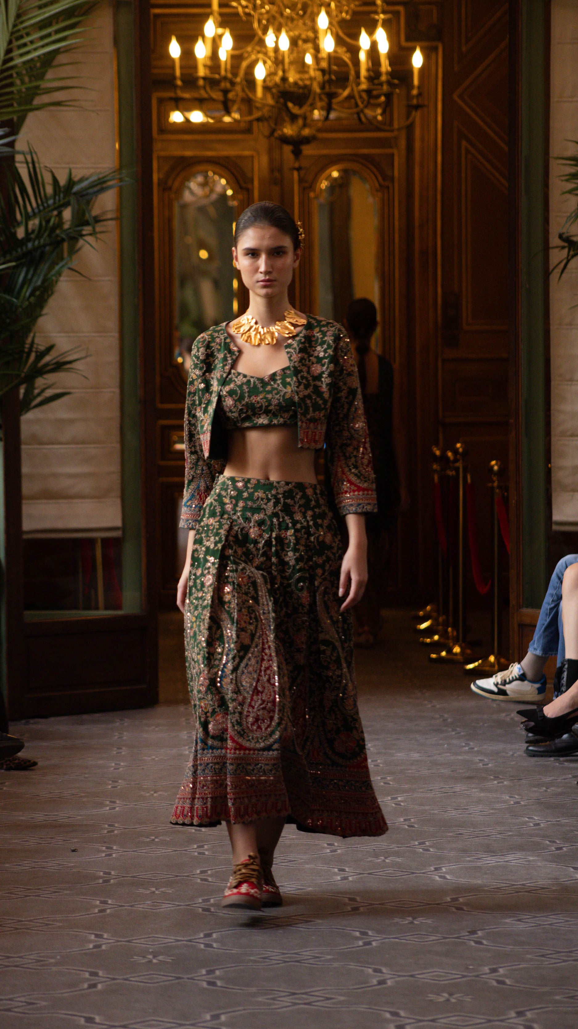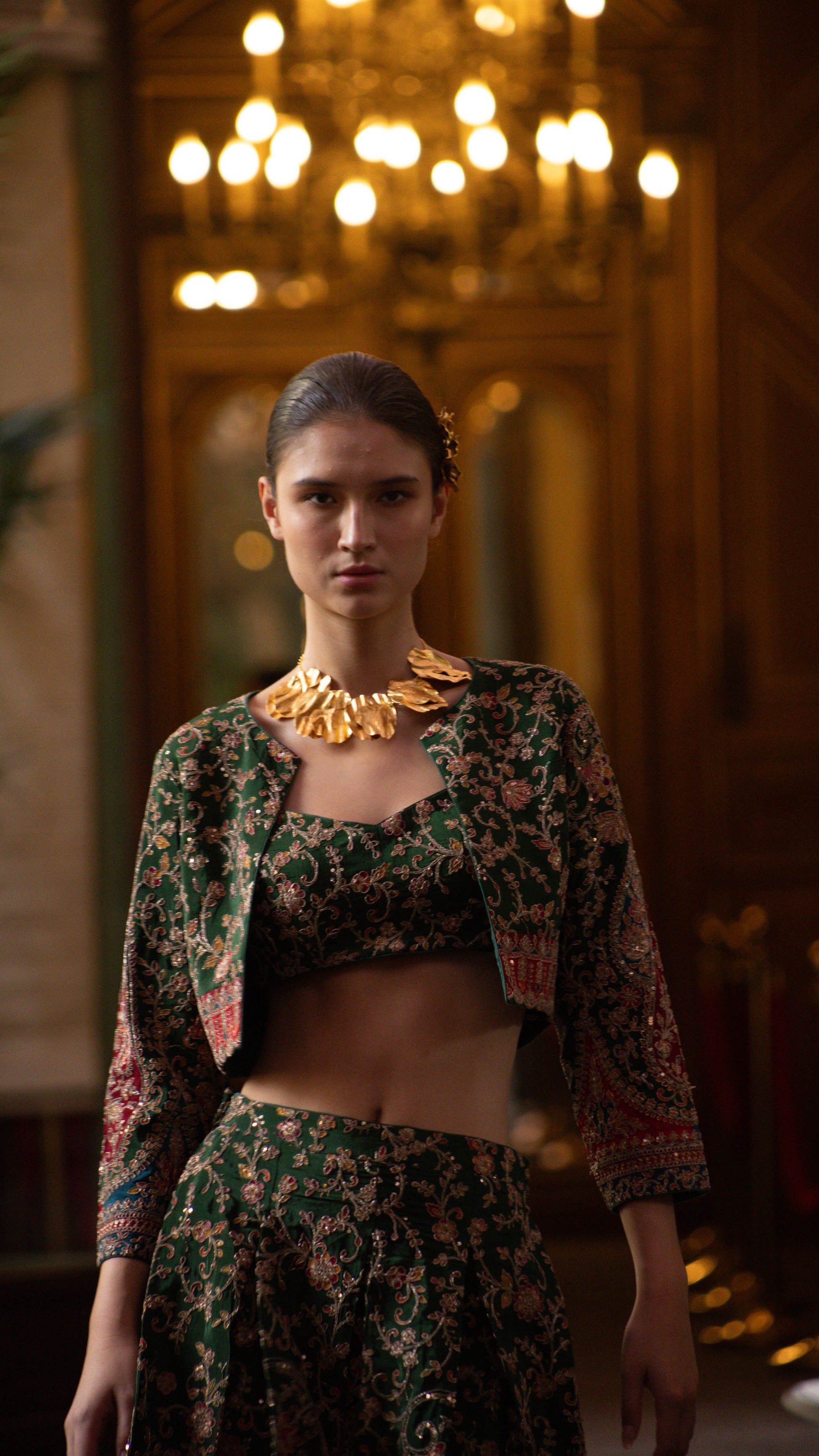 The jewel tone emerald green color skirt with crop top is perfect for any festivities or cocktail party.